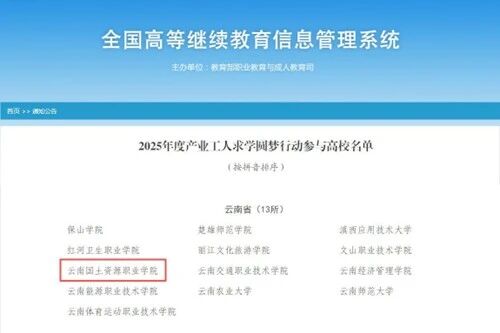 近日,教育部职业教育与成人教育司通过全国高等继续教育信息管理平台,正式发布了“2025年度产业工人求学圆梦行动合作高校名单”。经院校申报、省级教育行政部门遴选推荐、教育部专家评审评议,云南国土资源职业学院顺利入围,成为云南省获选的13所高职院校之一。此次成功入选,既是对我校整体办学水平、社会服务效能及人才培养质量的一致肯定,也是我校致力于地方经济建设和主动担当社会责任的直观体现。