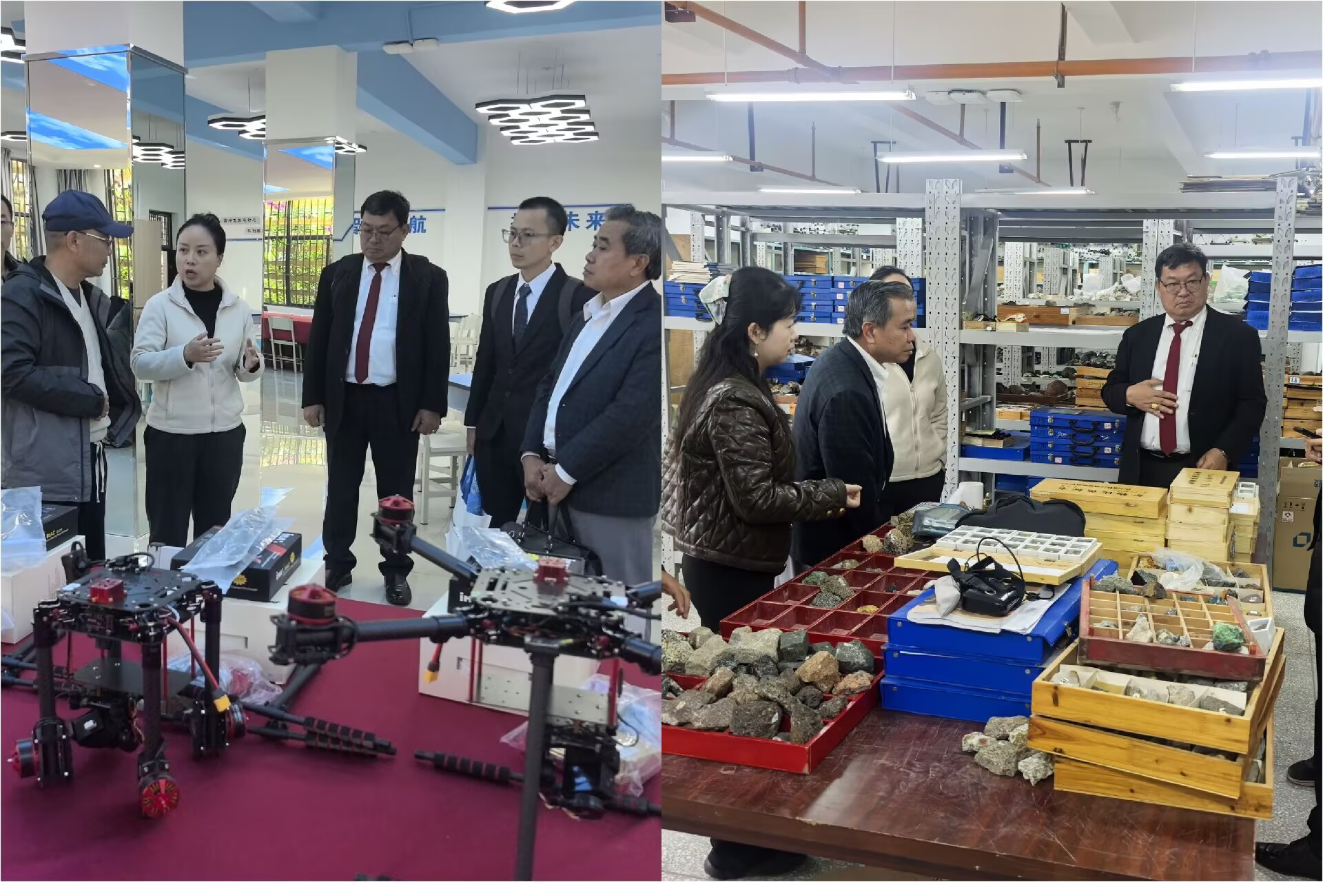 外宾一行还参观了资源环境学院、国土空间信息学院、珠宝旅游学院实训室,实地考察学校在地质勘探、无人机航测等领域的先进设施与教学实践成果,并与我校2025级老挝留学生亲切交谈,了解学校留学生培养情况。