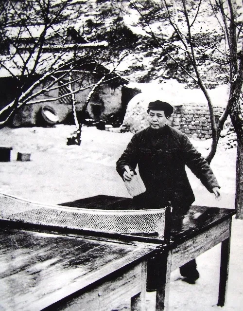 在陕西体育博物馆,1946年1月毛泽东在延安王家坪打乒乓球的巨幅图片,成了镇馆之宝。这幅图片真实记录了毛泽东即使在战争年代仍然带头锻炼身体的精彩瞬间。画面上,简陋的乒乓球案子前,毛泽东手持木板削刻出的不规则球拍,正在雪地上打乒乓球。毛泽东凭借这个“光板”球拍,参加了在延安开展的乒乓球比赛活动,成为当时陕甘宁边区的美谈。