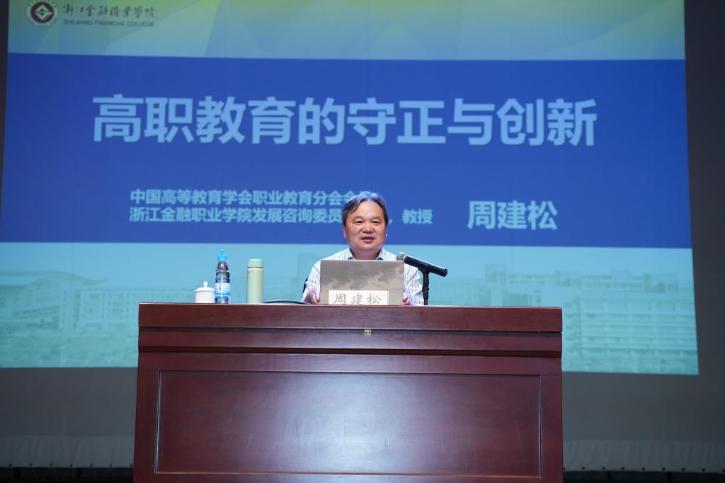 周建松教授从科学把握办学治校基本方略、新《职教法》的学习理解和浙江金融职业学院的探索实践三个方面讲解了高职教育的守正与创新。