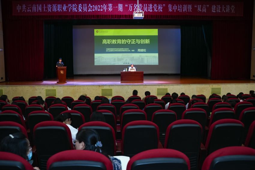 2022年7月6日下午,学校2022年第一期“万名党员进党校”集中培训暨“双高”建设大讲堂活动在明礼堂举行,本次培训邀请中国高等教育学会职业教育分会会长、浙江金融职业学院发展(双高建设)咨询委主任周建松教授主讲,开展了题为《高职教育的守正与创新为题》专题讲座。讲座由党委副书记李昆峰主持,全体教职工、全体学生党员参加。
