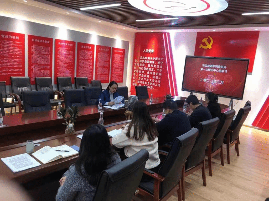 2022年3月4日,珠宝旅游学院党总支开展2022年第一次理论中心组学习,珠宝旅游学院党总支书记张颖、院长陈畅、总支副书记张军红、支部委员王娅力、李继红、孙杰、组织员刘迪参加了本次学习,会议由张颖书记主持。