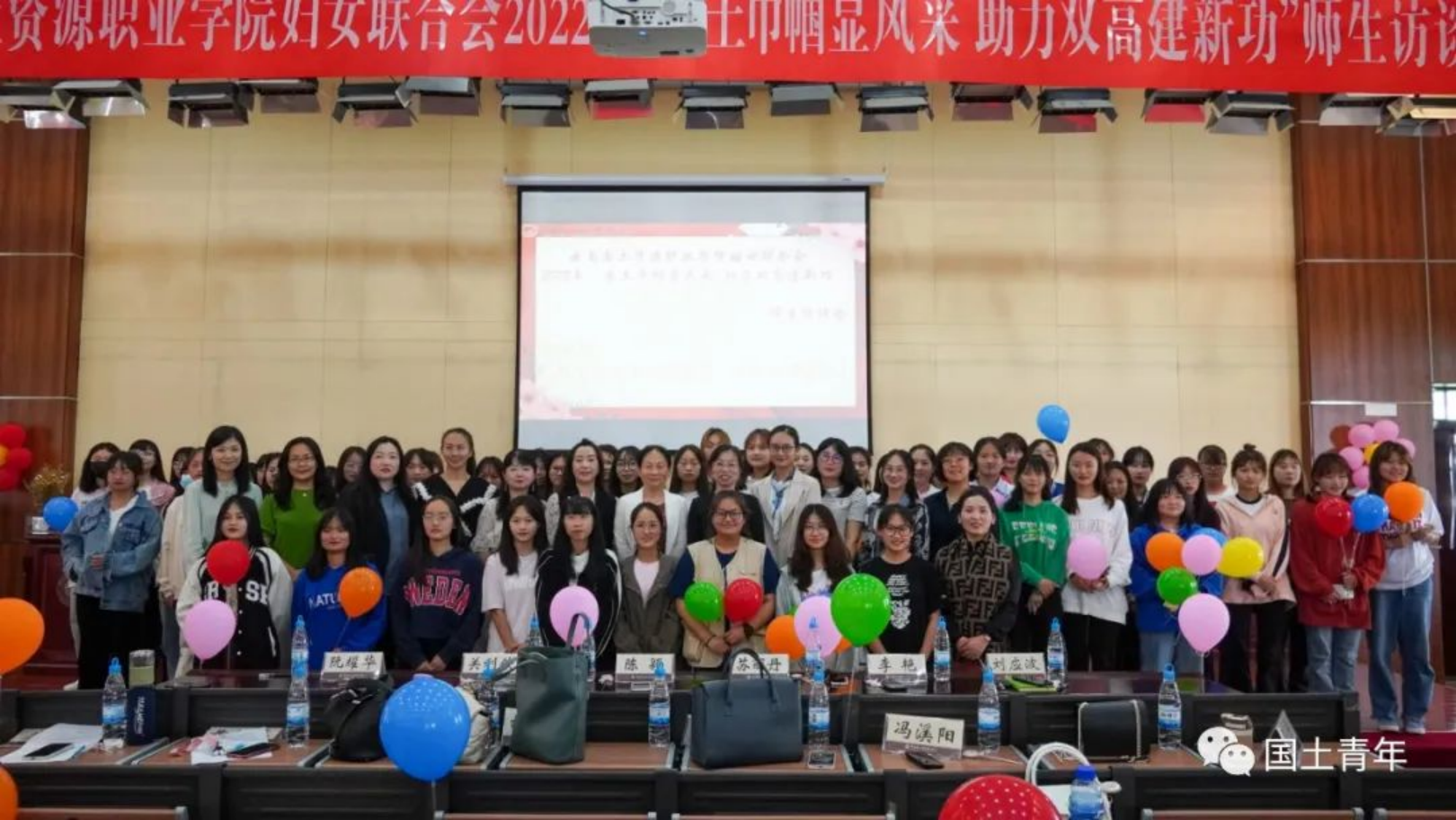 2022年6月8日14:00在宝鼎讲堂隆重举行校妇联2022年“国土巾帼显风采 助力双高建新功”师生访谈会。出席访谈会的领导有校妇联主席、校长陈颖,校妇联副主席、校工会常务副主席苏丽丹,校妇联副主席、校团委书记关利钦,校妇联综合事务委员、建设工程学院党总支书记李艳,校妇联文体委员、教务处副处长刘应波,校妇联权益维护委员、珠宝旅游学院教师阮耀华,以及访谈嘉宾庞璐、黄茜蕊、孔元元、胡晓燕、孙晓莉、冯溪阳、张宁7位女教师们和100名女学生代表参加。