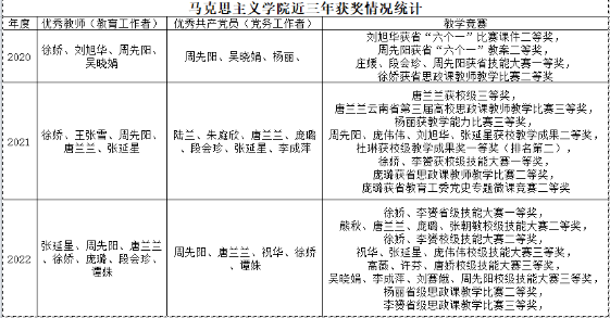 自马克思主义学院党总支成立以来短时间里,在一流党建的引领下,马克思主义学院课程建设取得显著成效。三年以来,学院各门课程的教学效果优良,获学生好评;教师获省级教学竞赛一等奖2项、二等奖6项、三等奖4项;编写教材4部,出版党史学习教育理论专著1部;申报省级课题并立项2项、厅级课题5项;获评校级教学成果奖二等奖1项;获评省级在线精品课程1门。