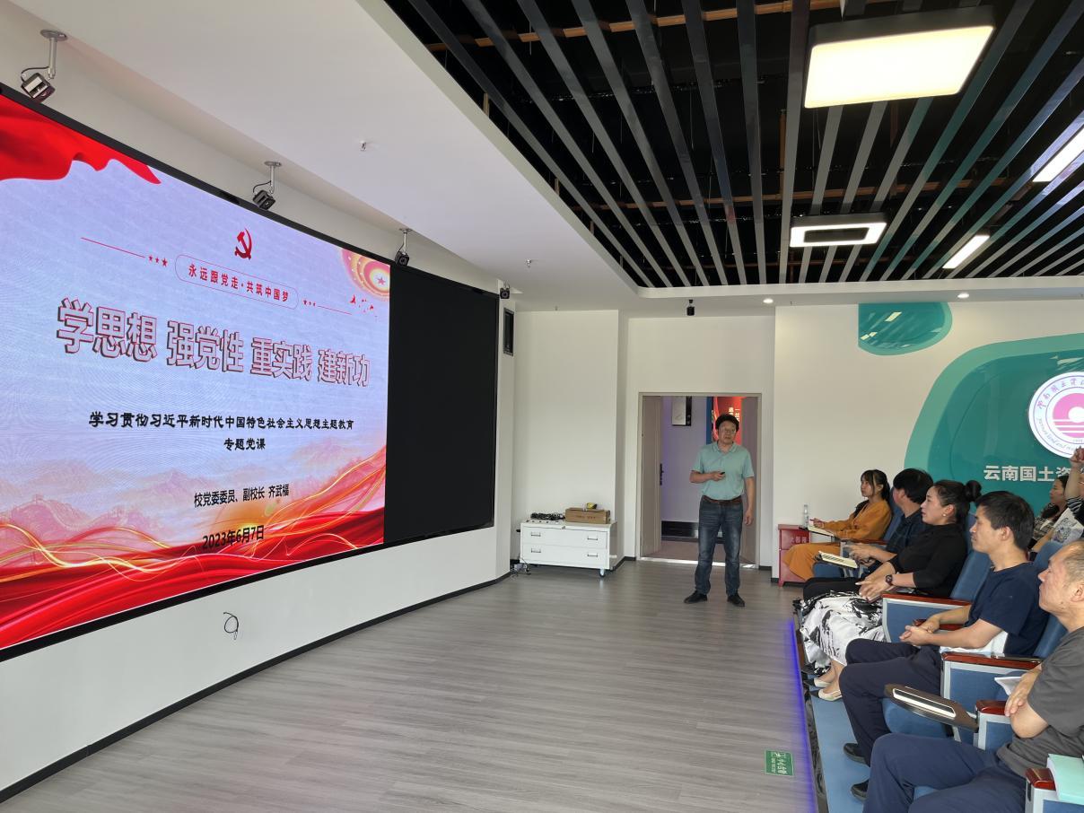 义思想,结合学校主题教育相关安排,落实“学思想、强党性、重实践、建新功”总体要求,推进主题教育走深走实,6月7日,学校党委委员、副校长齐武福在虚拟仿真实训室为资源环境学院全体党员开展“学思想、强党性、重实践、建新功——把主题教育学习为深入学习贯彻习近平新时代中国特色社会主义思想成效转化为资环实践”专题党课培训,资源环境学院全体教职工、入党积极分子现场聆听党课,党课由资源环境学院党总支书记关利钦主持。