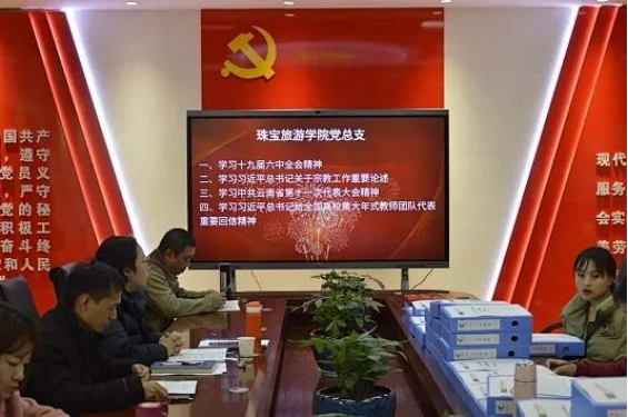 2021年12月8日星期三下午珠宝旅游学院党总支在勘物楼A303党员活动室开展主题学习活动,活动围绕学习党的十九届六中全会精神、学习习近平总书记关于宗教工作重要论述、学习中共云南省第十一次代表大会精神、学习习近平总书记给全国高校黄大年式教师团队代表重要回信精神四个方面展开。珠宝旅游学院党总支书记张颖主持,全体党员教师和入党积极分子参加。