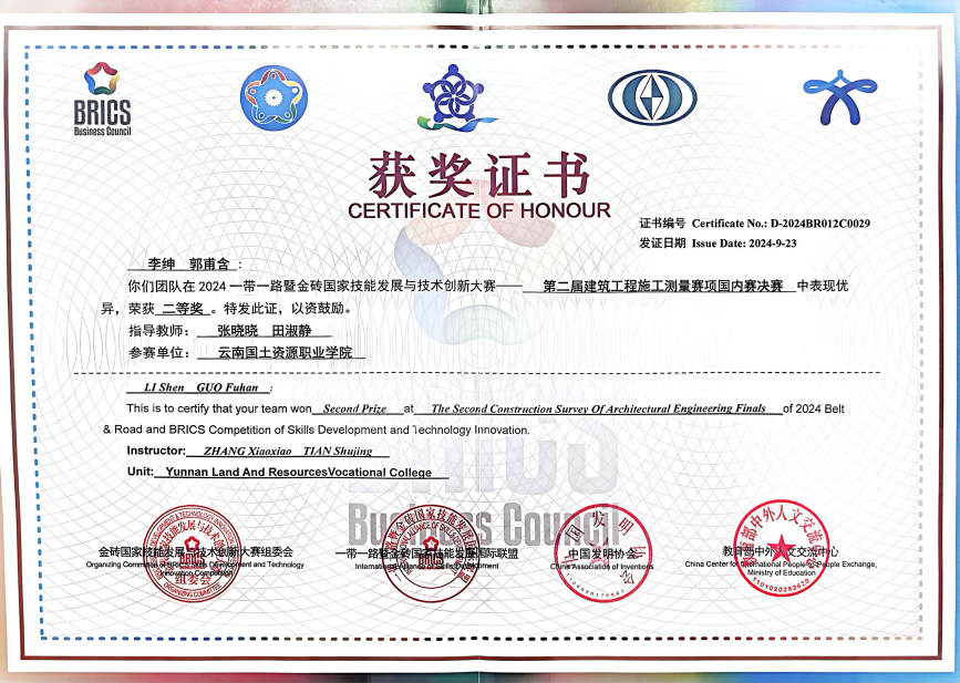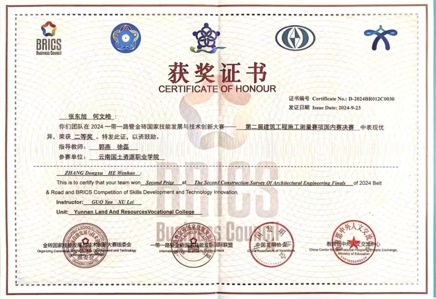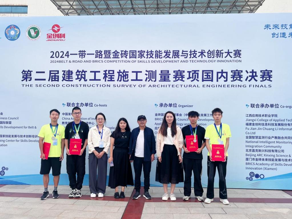 9月19—23日,由江西应用技术职业学院承办的2024年一带一路暨金砖国家技能发展与技术创新大赛第二届建筑工程施工测量赛项在江西赣州举行,我校国土空间信息学院23级测绘地理信息技术1班李绅、郭甫含、何文皓和23级测绘工程技术1班张东旭4位同学组成2支队伍,在张晓晓、田淑静、徐磊、郭燕4位老师的指导下,凭借出色的竞赛能力和专业知识,在此次比赛中均荣获二等奖,学校荣获优秀组织奖。