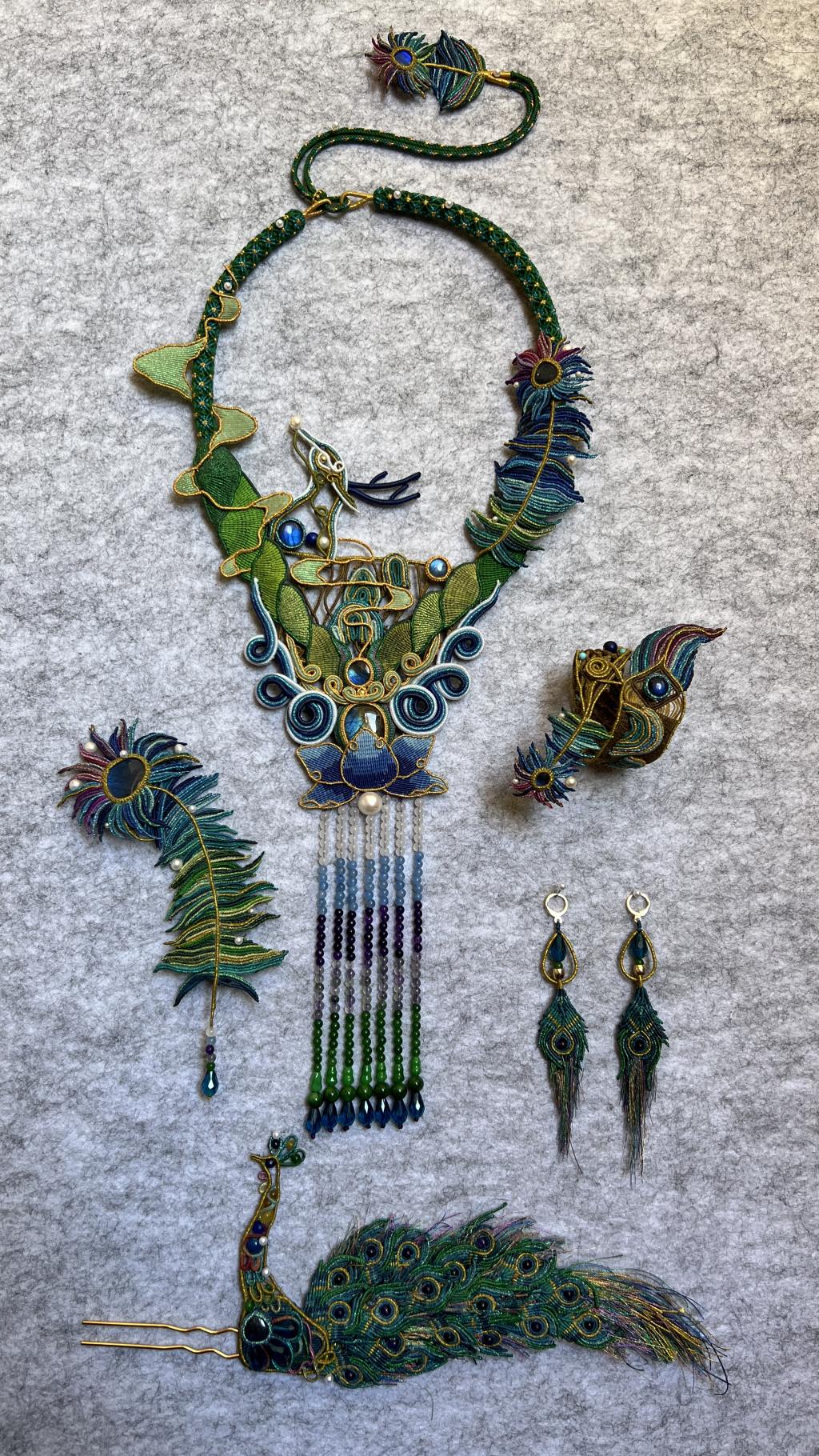 作品选用蜡线,采用绳艺首饰编织综合技法,以绳编和宝石镶嵌的方式,编织了一套集项链、耳环、发簪、手链、胸针为一体的首饰作品。一套栩栩如生的孔雀展翅造型表达了创作者吉祥如意、福瑞降临的美好祝愿,将云南的独特之美展现得淋漓尽致。正如大赛评委中国非物质文化遗产研究网总编辑孟庆功所言:“非遗文化的价值不仅在于它的历史厚度,更在于它在当代语境中的活态传承。”她的巧思设计和精湛的编织技术,让传统与现代相碰撞,使传统元素在新时代焕发了新的活力。