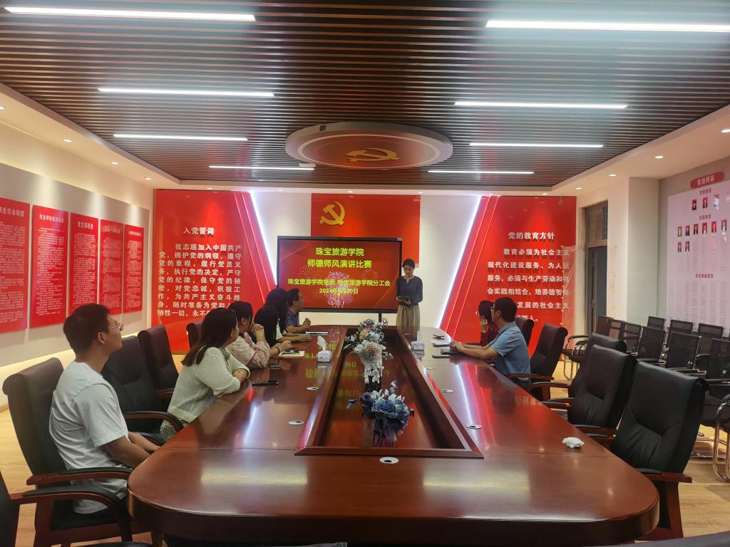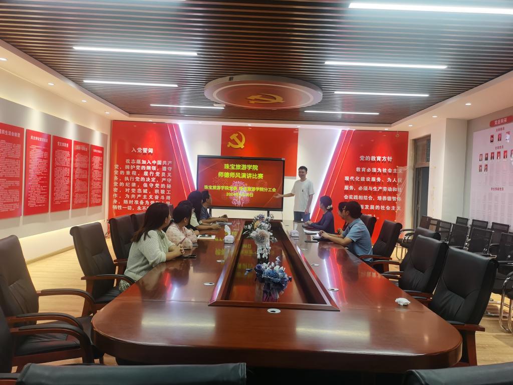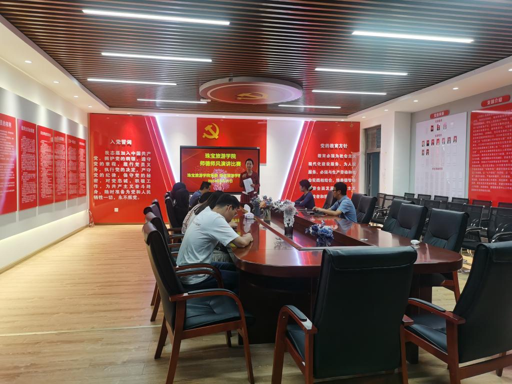 9月20日上午珠宝旅游学院分工会在勘物楼党建活动室举行师德师风演讲比赛。本次大赛由珠宝旅游学院党委书记袁佳主持。