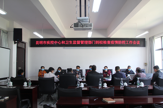 3月19日,昆明市疾控中心书记邱俊、副书记汪静、检验科主任罗伟、职员黄振华,阳宗卫生院院长蔡彦辉、副院长史佳敏、阳宗镇副镇长马文仙、社会事业局卫生科科长钟俊驿等一行到学校检查疫情防控工作。学校副校长寸建平、宣传部部长李光祥、组织部部长吴云恩、党委办公室(院长办公室)主任刘燕、学生与安全工作处处长李广涛、后勤基建处处长王春莲以及学校医护人员参加了会议。
