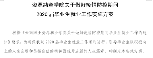 资源勘查学院制定了《资源勘查学院关于做好疫情防控期间2020届毕业生就业工作实施方案》,设立了资源勘查学院就业服务党员先锋岗,并组建了资源勘查学院就业服务党员突击队,为确保2020届毕业生就业服务工作顺利进行。