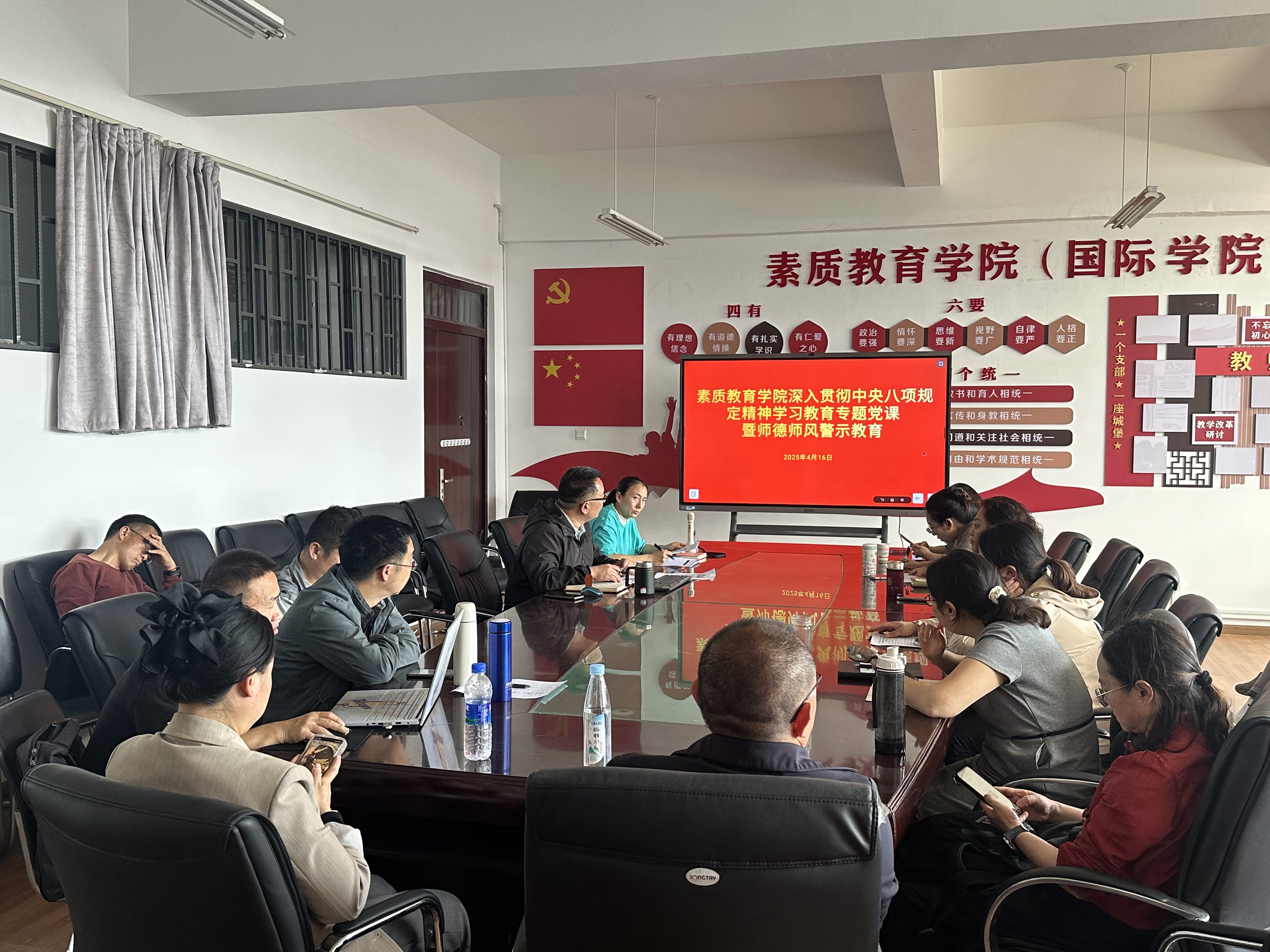 4月16日,素质教育学院召开了深入贯彻中央八项规定精神学习教育专题党课暨师德师风警示教育会。全体党员干部及教职工参加会议