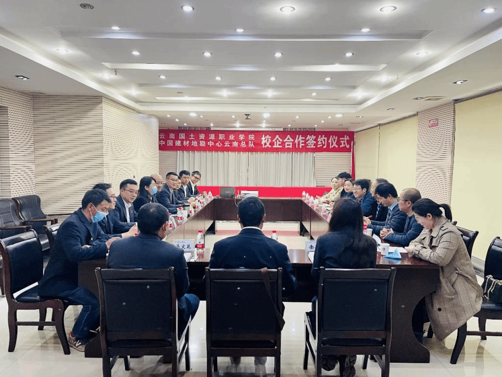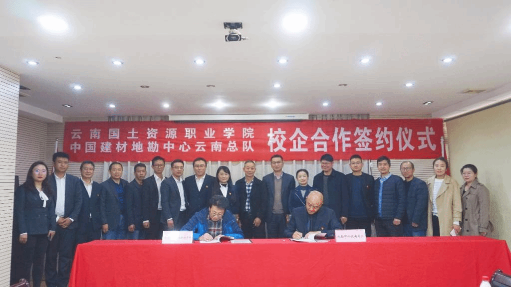2022年3月3日下午,云南国土资源职业学院与中国建材地勘中心云南总队/昆明中材勘察设计院有限公司校企合作协议签约暨授牌仪式在昆明举行。云南国土资源职业学院副校长齐武福,中国建材地勘中心云南总队党委书记、总队长杨文杰代表双方签署协议。资源环境学院院长左琼华、党总支书记李倩、副院长程先锋、副书记徐永全、办公室主任刘陈明、地灾专业群教研室主任丁凤凤、地调专业群教研室主任应玺,中国建材地勘中心云南总队党委副书记、纪委书记王娅,党委委员、副总队长杨朝辉,所属单位、有关部门负责人共计20人出席签约授牌仪式。