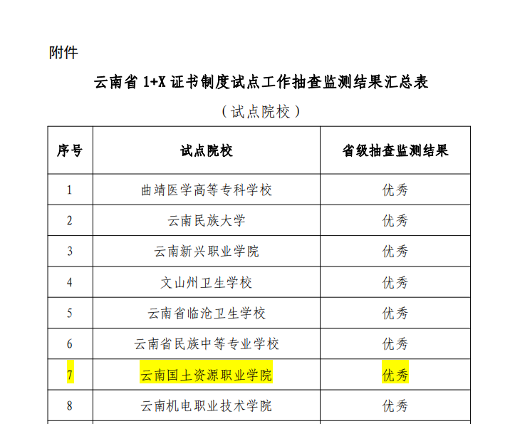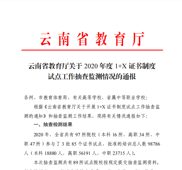 近日,云南省教育厅对全省97所院校(本科16所,高职34所,中职47所)2020年度1+X证书制度试点工作抽查监测情况进行了通报,我校评分结果为“优秀”。